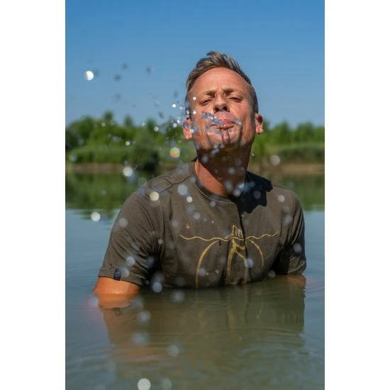 La camiseta sumergida es predominantemente de color verde oliva con un acabado de piel de melocotón que le da una textura suave y aterciopelada y se siente extremadamente cómoda contra la piel. Ideal para uso en verano o como una de varias capas durante el clima más frío. En la parte delantera de la camiseta hay una gran impresión del logotipo de Korda sumergido, justo debajo de la superficie del agua, como una carpa tomando el sol en las aguas superiores. El resultado es una camiseta única y elegante que puedes usar en cualquier lugar. Solo está disponible en verde oliva y en tallas pequeñas a XXXL.