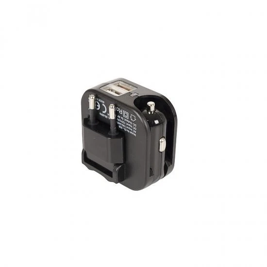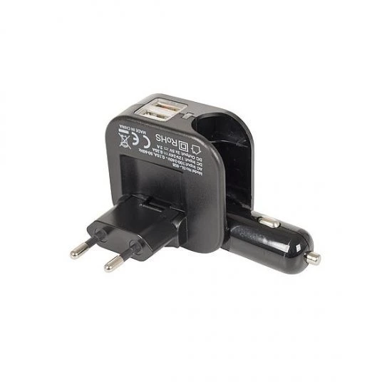 Un cargador USB de alta velocidad. Proporciona 2 puertos USB con 10 vatios cada uno. El enchufe es plegable por lo que el cargador es muy compacto para llevar.