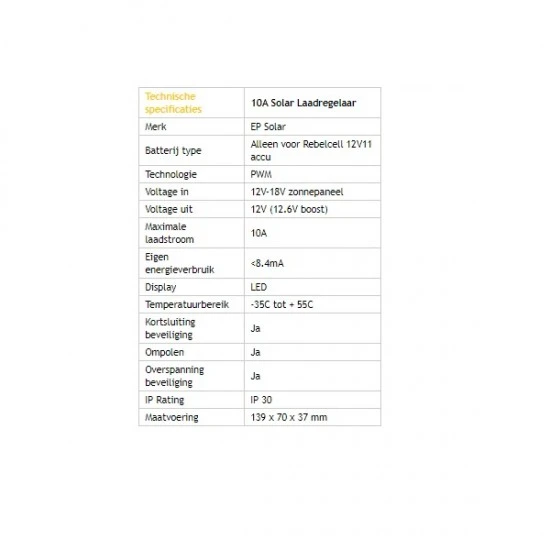 - La tecnología de carga PWM proporciona corriente constante (máx. 10 A) para cargar la batería de manera segura y eficiente. El controlador de carga está programado para su uso con baterías de iones de litio Rebelcell Angling