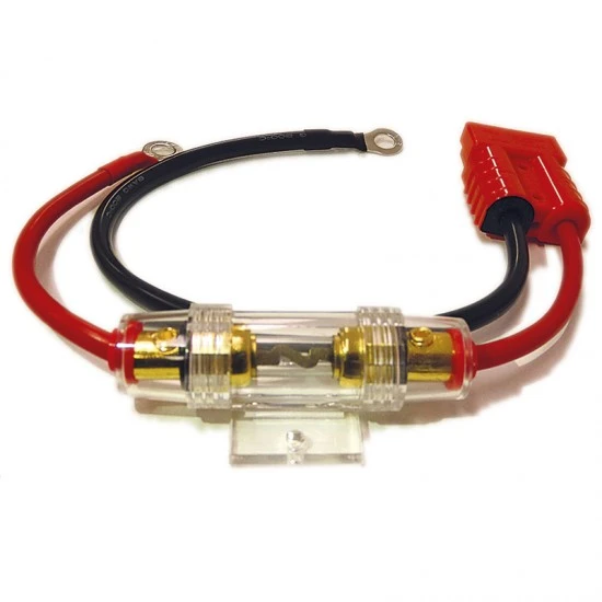 Cable adaptador de Anderson SB50 rojo a terminal de anillo de 8 mm con fusible de 60 A con cable negro y rojo (ambos de 10 AWG/6 mm2) para conectar fácilmente su motocicleta a una batería JAROCELLS BT. Útil para conectar motores donde se prescribe que se debe colocar un fusible entre el motor y la batería.