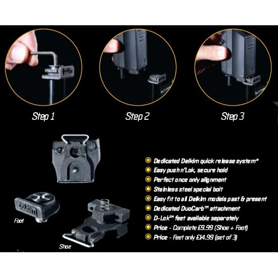 El sistema de liberación rápida D-Lok de Delkim es un sistema revolucionario desarrollado que le permite quitar rápida y fácilmente la alarma de mordedura de Delkim de una barra de pértiga o de un zumbador sin tener que desenroscarla.