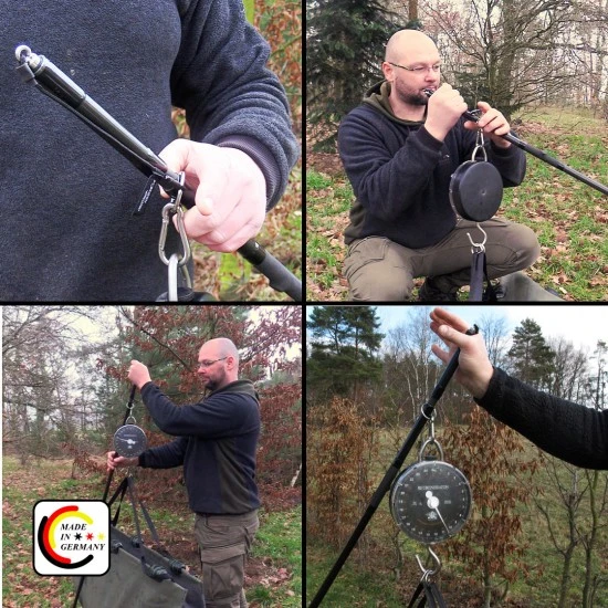 El sistema de levantamiento de pesas es de gran ayuda a la hora de pesar la captura. Este sistema ayuda a determinar el peso de la captura de forma segura y sin tambaleos. El peso del pez se transfiere directamente por la caña sin extenderla. Por lo tanto, una indicación de peso fluctuante es cosa del pasado. Especialmente en pesos más altos. Tome el palo sobre la báscula y empuje hacia arriba, sostenga por un momento y lea el peso. Simple y sin esfuerzo.