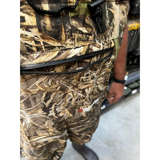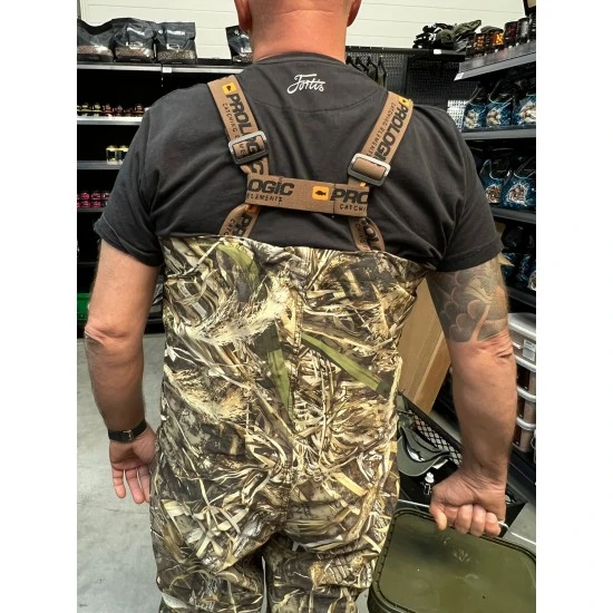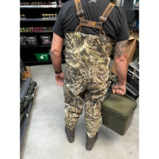 Ahora disponible en Team Outdoors el pie de bota Prologic Max5 Taslan Chest Wader. El Chest Wader está hecho de material de PVC de calidad duradera. El Chest Wader tiene un tirante estilo H ajustable para que pueda obtener el ajuste deseado. En la parte delantera hay un bolsillo frontal resistente al agua con cremallera. Práctico para almacenar materiales pequeños. También puede sentarse fácilmente sobre sus rodillas porque hay rodilleras en el interior. Esto lo hace mucho más cómodo. El juego de adhesivos está incluido y en la parte inferior del Chest Wader hay botas de PVC totalmente forradas de neopreno.