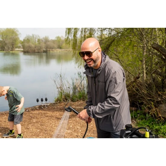 La ducha eléctrica para exteriores RidgeMonkey es compatible con cualquier dispositivo que proporcione una fuente de alimentación constante de 12 V 2 A, por ejemplo, una fuente de alimentación, una batería o un vehículo. La tapa de la ducha también se puede quitar y reemplazar con la tapa convencional del Water Carrier y el grifo integrado, convirtiendo al Water Carrier nuevamente en un bidón sellado estándar.
