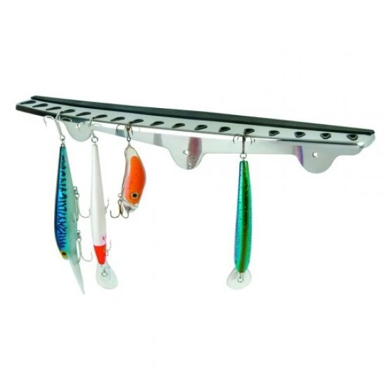 El nuevo colgador plegable de acero inoxidable plegable para colgar los ganchos de forma segura. Inserciones protectoras de silicona alrededor de cada abertura del gancho. Puede contener hasta 17 señuelos.