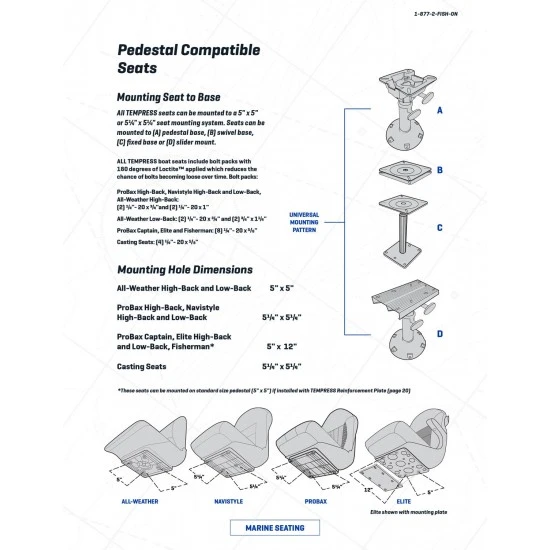 - Fácil instalación; acepta cualquier pedestal o sistema de montaje de asiento de barco de 5 ¼» x 5 ¼»
