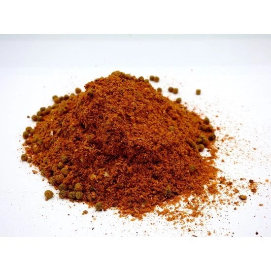 Harina de pescado, harina de krill, chile, etc. mezclados con partículas finas mezcladas y agregados de mini gránulos de halibut.
